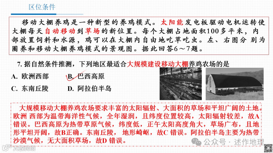 7.B【 解析】大规模移动大棚养鸡农场要求丰富的太阳辐射、大面积的草场和平坦广阔的土地。欧洲 西部为温带海洋性气候,全年湿润,且纬度位置较高,太阳辐射较差,故A 错误。巴西高原为 热带草原气候,纬度低,正午太阳高度角大,草场广布,且地形平坦开阔,故B 正确。东南丘陵, 地形崎岖,故C 错误。阿拉伯半岛主要为热带沙漠气候,无大面积草场,故D 错误。