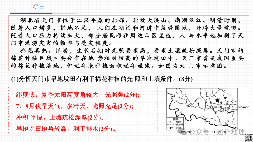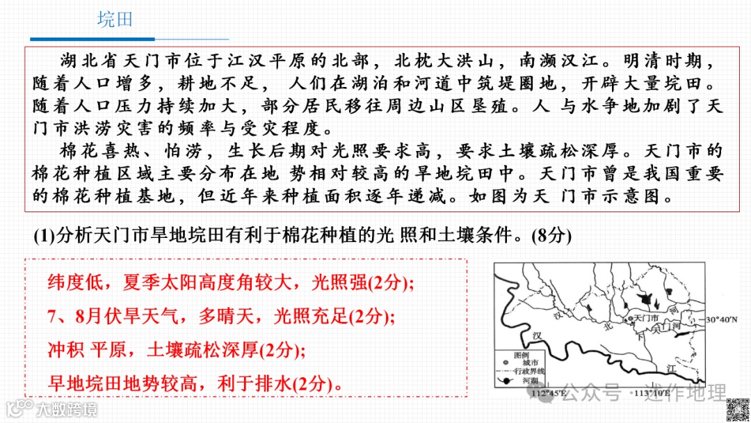 (1)分析天门市旱地垸田有利于棉花种植的光 照和土壤条件。(8分)