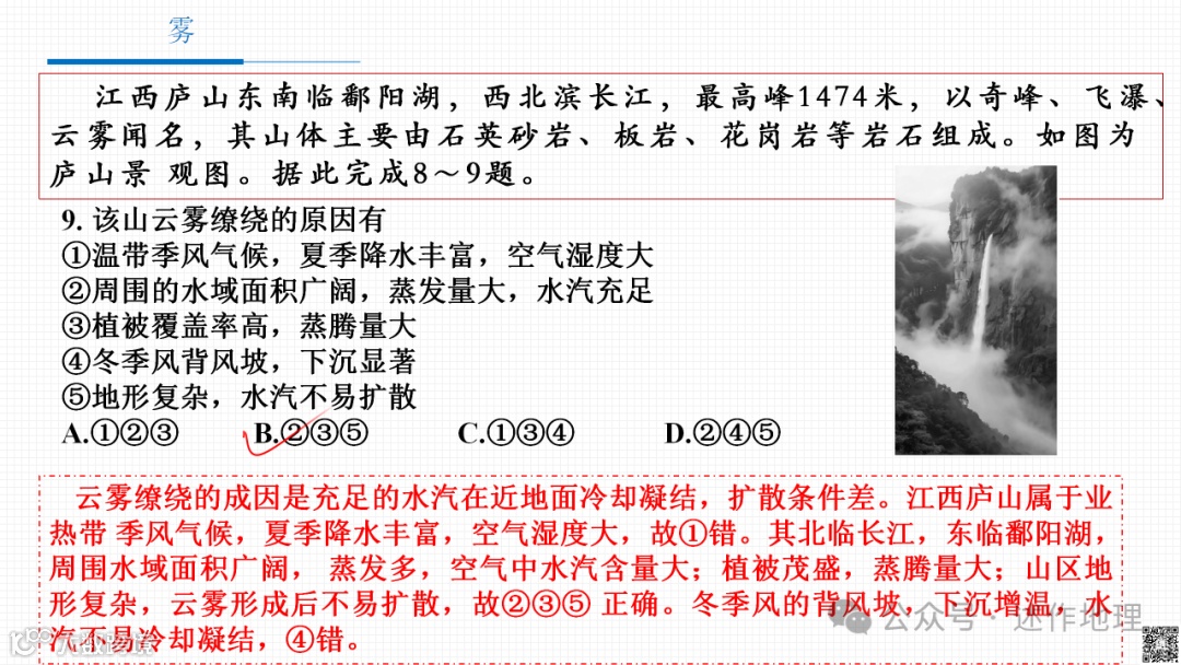 9.B【 解析】云雾缭绕的成因是充足的水汽在近地面冷却凝结,扩散条件差。江西庐山属于业热带 季风气候,夏季降水丰富,空气湿度大,故①错。其北临长江,东临鄱阳湖,周围水域面积广阔, 蒸发多,空气中水汽含量大;植被茂盛,蒸腾量大;山区地形复杂,云雾形成后不易扩散,故②③⑤ 正确。冬季风的背风坡,下沉增温,水汽不易冷却凝结,④错。