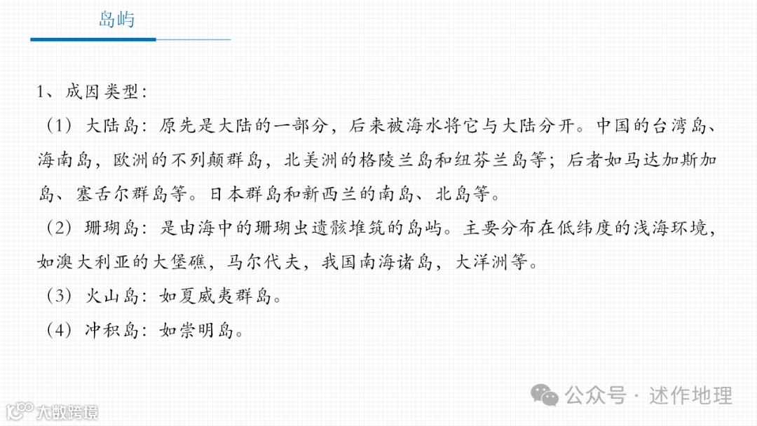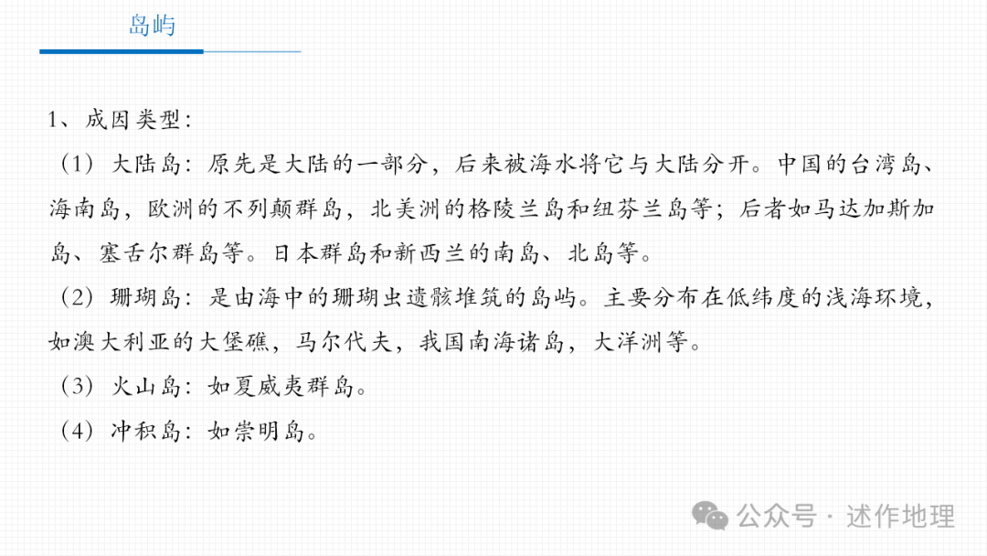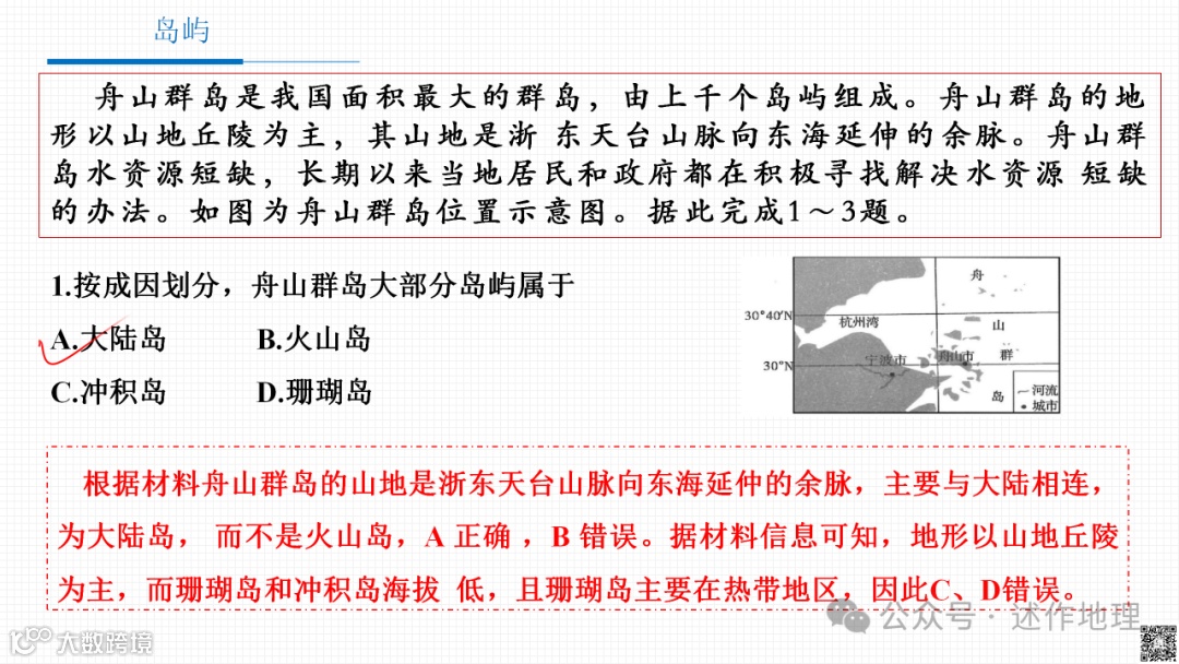 1.A 【 解析】根据材料舟山群岛的山地是浙东天台山脉向东海延仲的余脉,主要与大陆相连,为大陆岛, 而不是火山岛,A 正 确 ,B 错误。据材料信息可知,地形以山地丘陵为主,而珊瑚岛和冲积岛海拔 低,且珊瑚岛主要在热带地区,因此C、D错误。