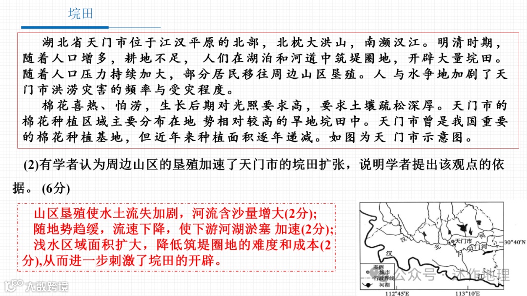 (2)有学者认为周边山区的垦殖加速了天门市的垸田扩张,说明学者提出该观点的依据。(6分)