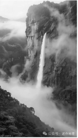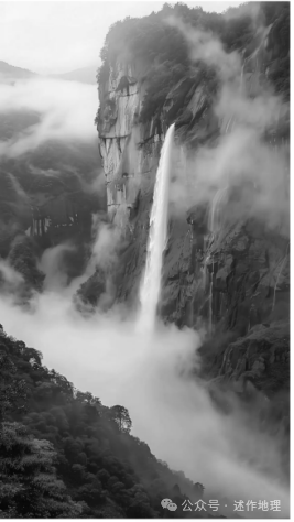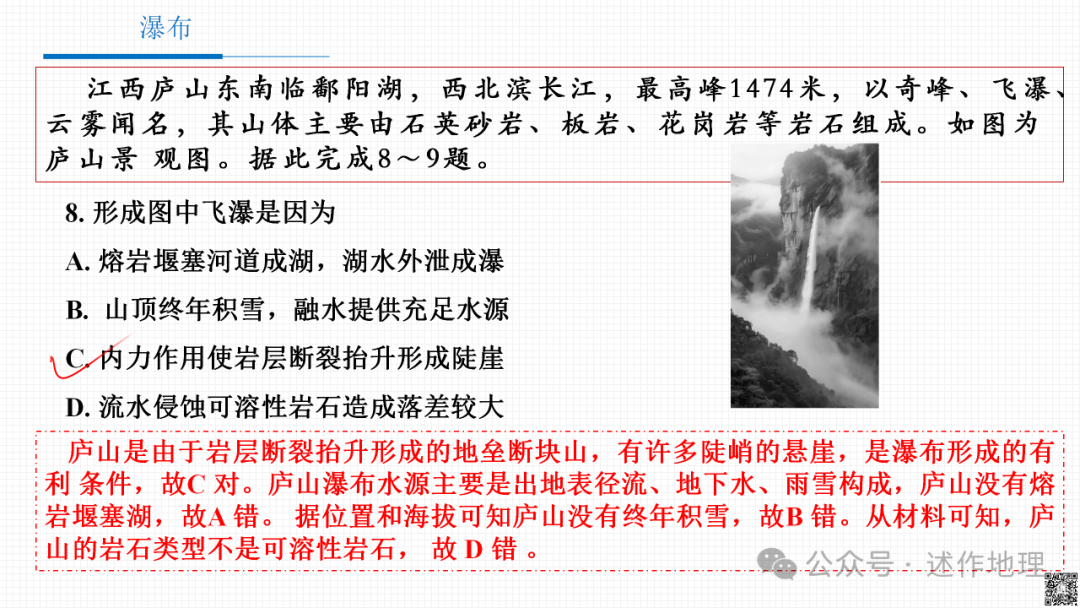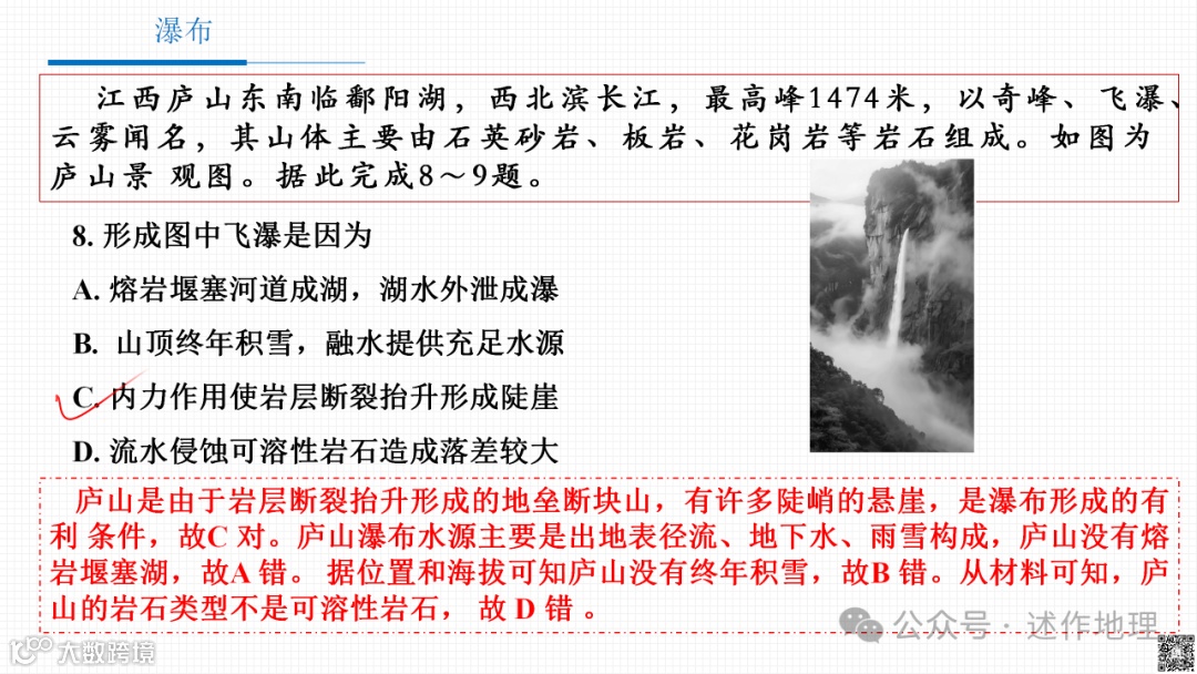 江西庐山东南临鄱阳湖,西北滨长江,最高峰1474米,以奇峰、飞瀑、 云雾闻名,其山体主要由石英砂岩、板岩、花岗岩等岩石组成。如图为庐山景 观图。据此完成8~9题。