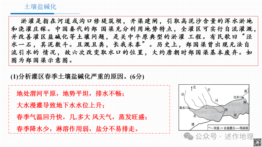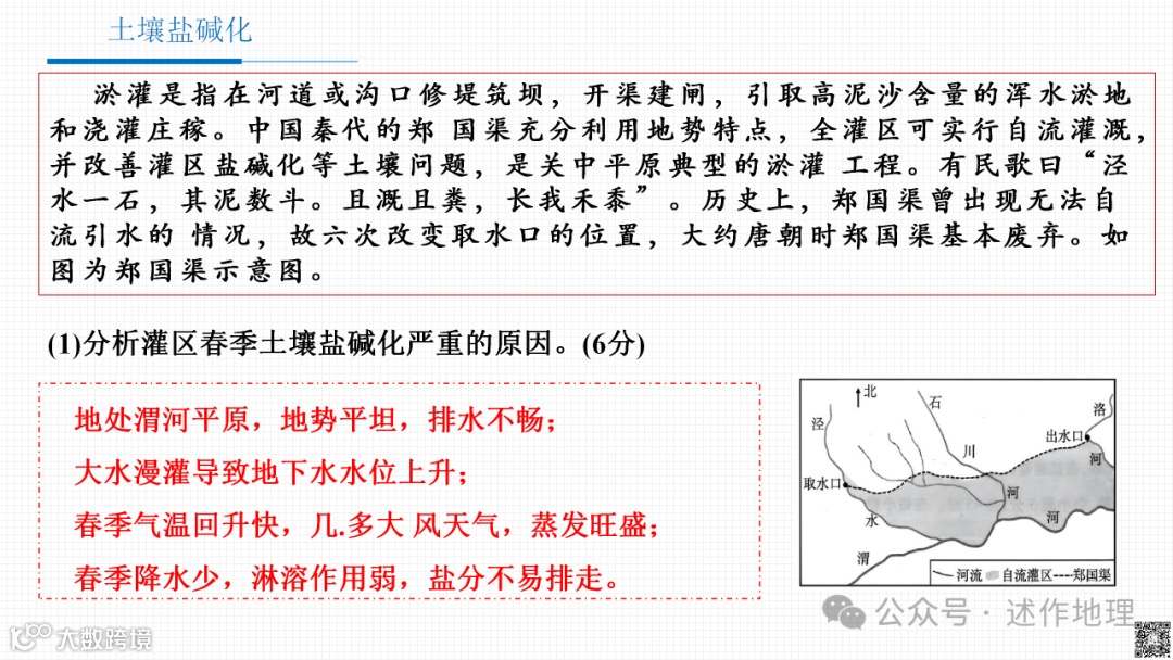 地处渭河平原,地势平坦,排水不畅;大水漫灌导致地下水水位上升;春季气温回升快,几.多大 风天气,蒸发旺盛;春季降水少,淋溶作用弱,盐分不易排走。(每点2分,任答3点得6分)