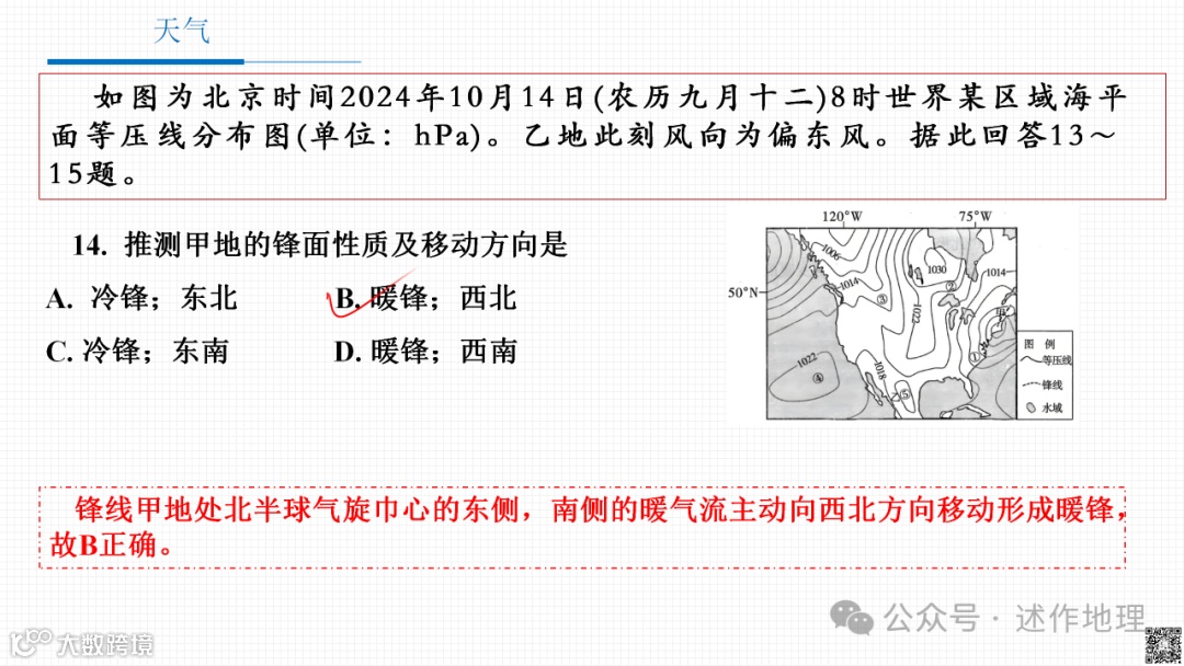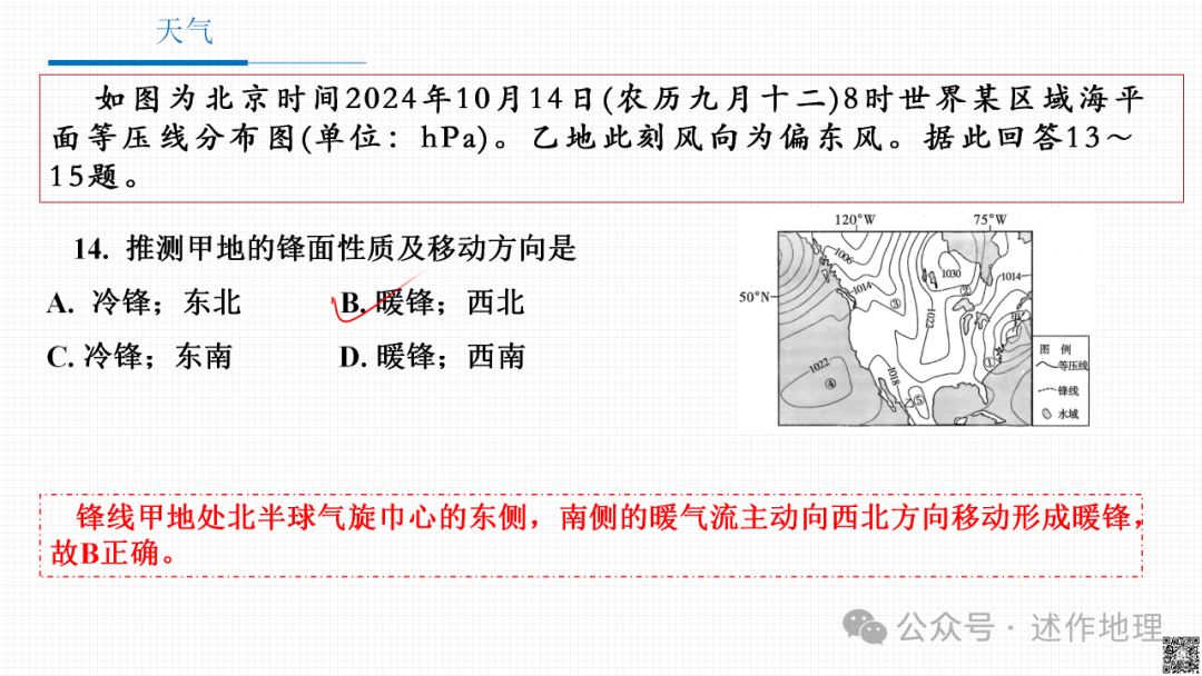14.B 【解析】锋线甲地处北半球气旋巾心的东侧,南侧的暖气流主动向西北方向移动形成暖锋,故B正确。