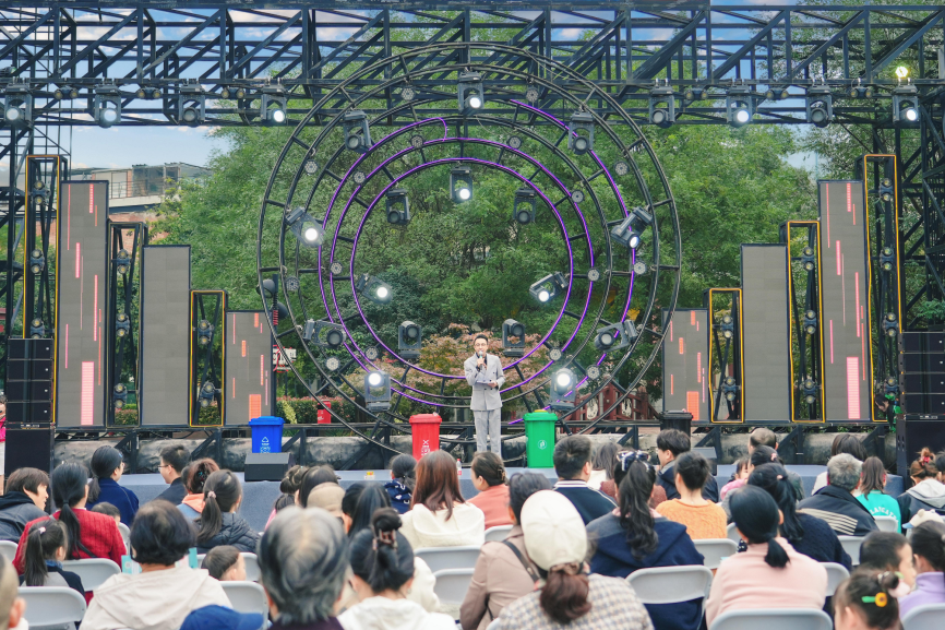 活动于当日15:00准时开始,一支活力四射的开场舞《垃圾分类也时尚》瞬间点燃了全场热情,演员们以活力四射的舞姿,结合四色分类桶道具,直观地展现垃圾分类主题的同时,也拉开了活动的序幕,现场瞬间变成了欢乐的海洋。随后,是一首歌曲《分拣时光》,歌手用通俗易懂的歌词、优美的旋律,向现场观众讲解了垃圾分类投放的要点,助力大家正确分类,传递了践行绿色生活方式的理念;相声《出口成章话分类》最受观众喜爱,演员以幽默诙谐的“贯口”形式,将垃圾分类知识巧妙串联,既突出了垃圾分类的主题,更提高了分类知识宣传的趣味性,逗得大家捧腹大笑;引人入胜的沙画表演《指尖上的绿洲》,是为此次活动特别创作的节目,表演者用手指在画板上以细沙为颜料,勾勒出一幅古城的街景和街景之下的垃圾分类场景,用指尖的艺术点明源头减量、垃圾分类资源再生的主题,极具视觉冲击力和感染力。此外,魔术《垃圾分类跟我学》将奇幻魔术与分类知识相结合,互动性强,极大地激发了孩子们的兴趣。