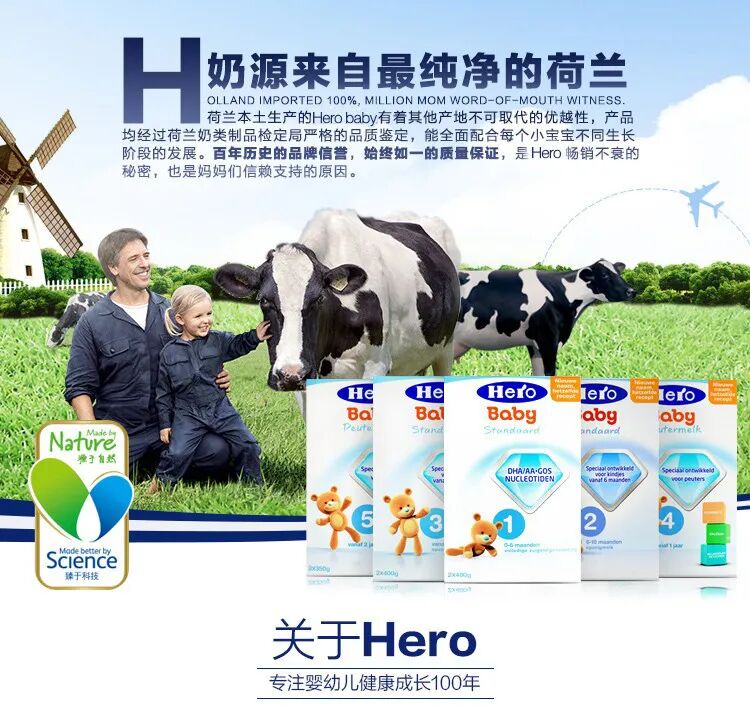 Hero baby是荷兰皇家乳业旗下百年奶粉品牌。美素的奶源和一般的乳业集团不同,荷兰皇家乳业是合作型乳企,由欧洲超过20,000名左右会员农场主联合经营,共同管理,所以它的奶源不是工业化的采购,而是完全从源头来把控。