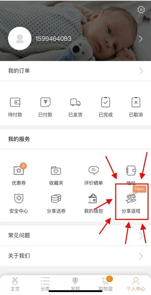 好友下单后,点击【个人中心】,找到【分享返现】查看返现金额。