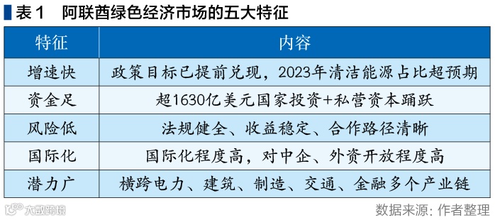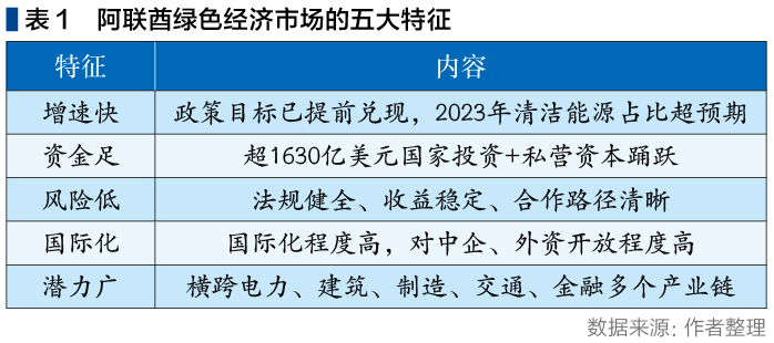 阿联酋正试图在中东率先完成“去油化”转型,着力发展可再生能源、绿色建筑、绿色金融、氢能交通与循环经济等多个具有万亿级潜力的前沿领域,意图在“后石油时代”构建新的国家竞争力。得益于政策驱动、资金支持和技术开放,其绿色经济市场呈现出增速快、资金足、风险低、国际化、潜力广等特征(见表1)。 预期阿联酋将在未来几十年持续释放大规模投资红利与国际合作机会,吸引全球绿色企业与资本涌入。