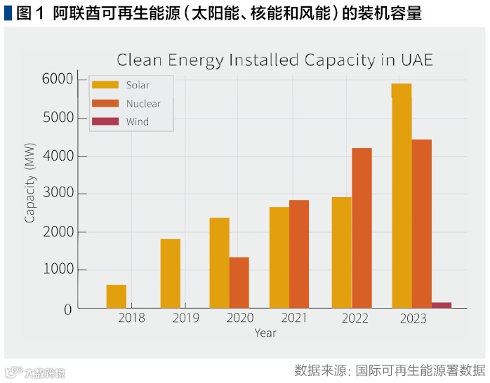 通过上述差异化措施,阿联酋既大力发展了太阳能等可再生能源项目,又成功建设了区域首座商用核电站。可再生能源项目实现了快速扩张和成本下降,截至2023年阿联酋太阳能装机已达5900兆瓦;在核电方面,巴拉卡核电站四台机组全面投运后可承担全国约25%的电力需求。两种清洁能源协同作用,使阿联酋有望在2030年前实现清洁能源占比的大幅提升,为阿联酋整体能源转型和气候目标作出关键贡献。各技术所获得的定制化支持策略,保障了阿联酋清洁能源战略的全面推进和长期可持续性。图1为2018~2023年阿联酋可再生能源(太阳能、核能和风能)的装机容量数据对比,风能在2023年前占比极小。