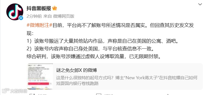 综合研判,该账号涉嫌通过虚假人设博取流量,已无限期封禁。