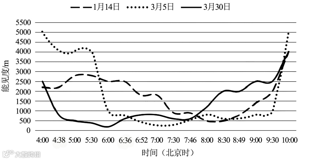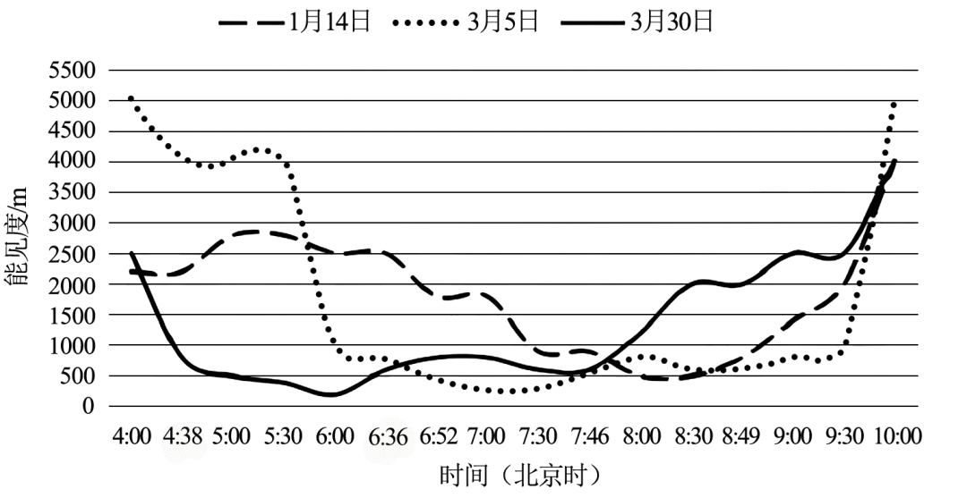 辐射雾是由地表辐射冷却作用使近地面大气水汽凝结而成,具有明显的季节性和日变化,其来去突然,具有一定的难预报性。2024年1—3月广西南宁发生3次大雾天气,严重影响交通出行。下图为3次大雾期间的大气能见度变化。据此完成下面小题。