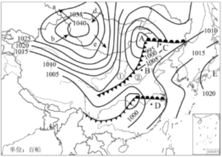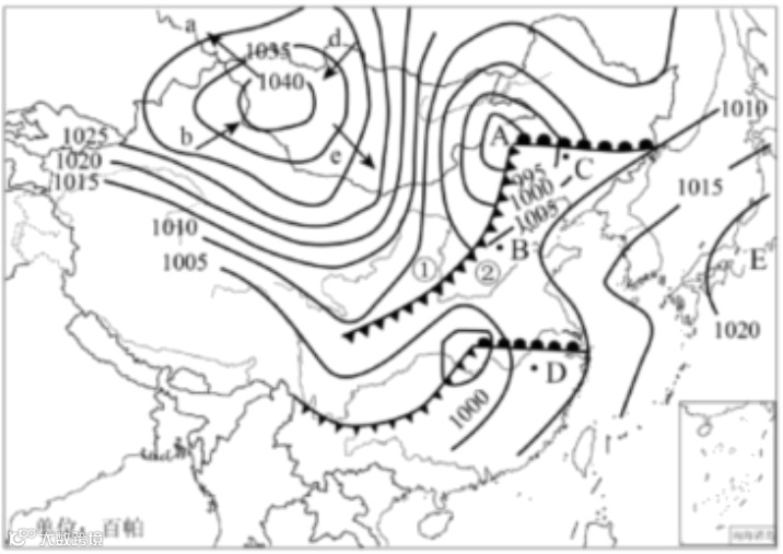 (4)上图中B、C、D三地中,即将发生明显天气变化的是 ,原因是该地将受到 天气系统的影响。从利弊两方面说出该天气系统给当地带来的影响 。