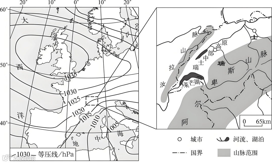 下图示意欧洲部分区域某日某时刻海平面气压分布形势。冬季受该气压形势控制时,瑞士中部高原地区风速较大,最大风速位于莱芒湖区,时速可超过100千米。据此完成下面小题。