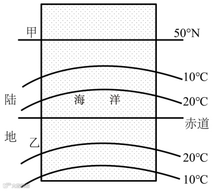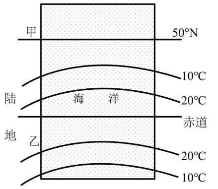 下图为某理想陆地某月份等温线分布模式图,据此完成下面小题。