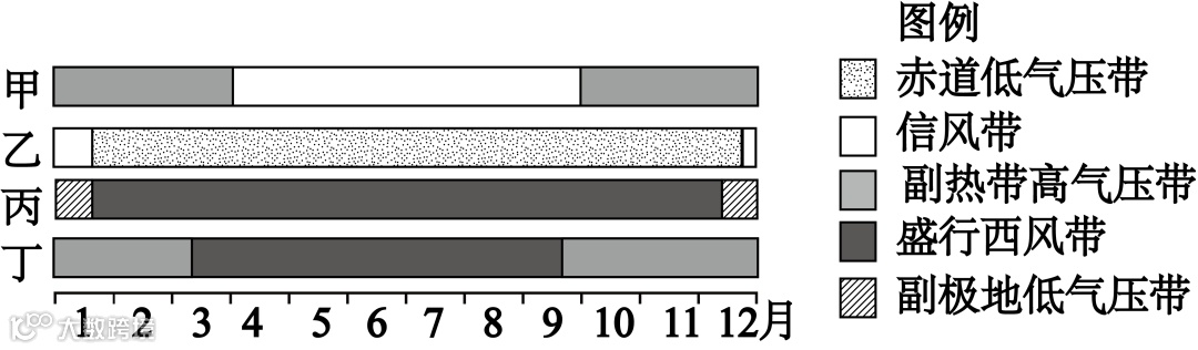 读“四地受气压带和风带控制时间示意图”,完成下面小题。