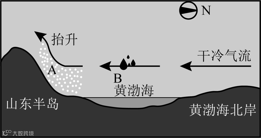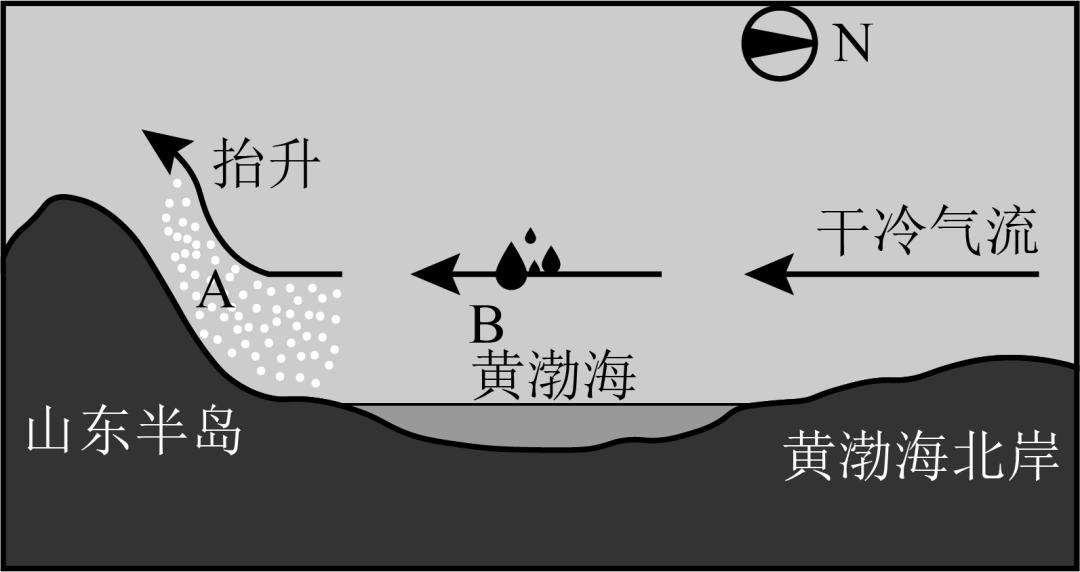 2023年12月22日,一股强冷空气流经渤海和黄海海面在山东半岛北侧登陆,致使烟台、威海出现冷流暴雪,给当地居民出行带来不便。下图山东半岛冷流降雪示意图。完成下面小题。