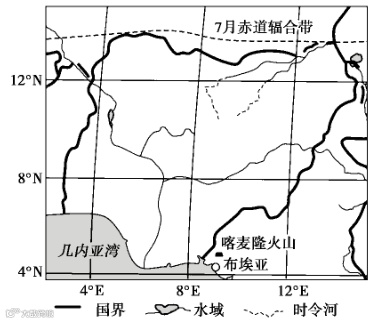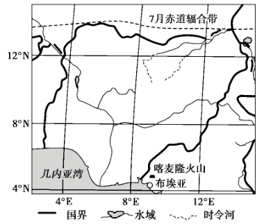 非洲西部的赤道辐合带是东北信风、东南信风、几内亚季风汇合形成的狭窄气流辐合区,其位置的季节性移动会影响区域降水状况。几内亚湾沿岸的布埃亚被称为“非洲雨极”。下图示意非洲部分区域7月赤道辐合带位置。完成下面小题。