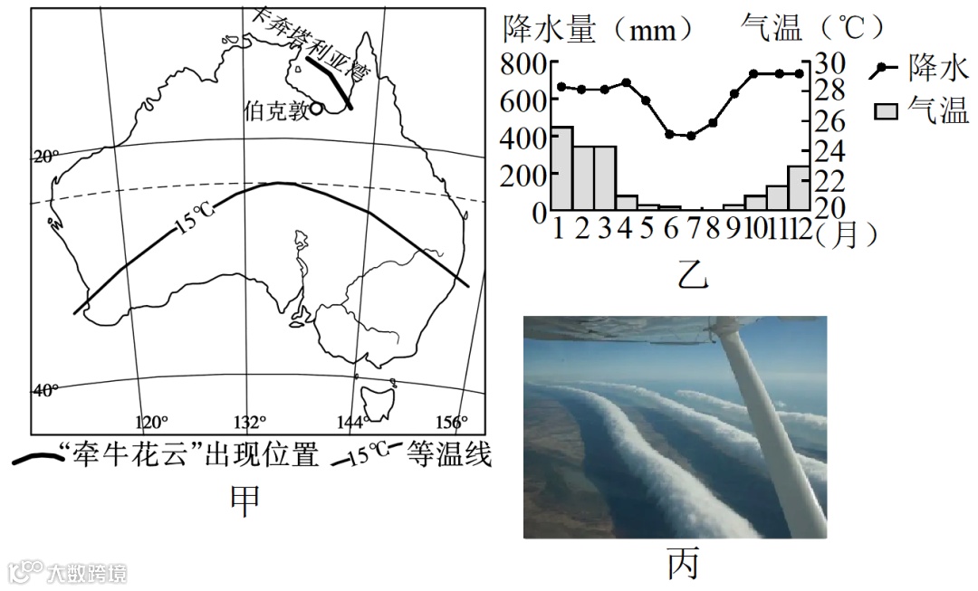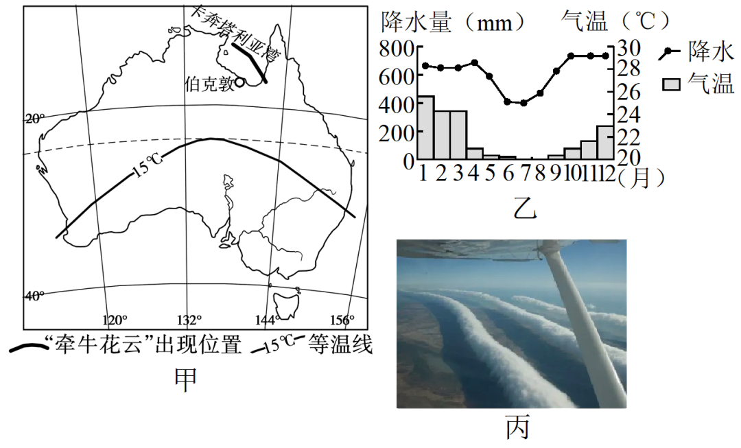“牵牛花云”形成于海上,呈有序线状排列,在早晨伴随着朝霞逐渐向陆地移动,到达陆地上空后逐渐消散。甲图为常出现“牵牛花云”现象的卡奔塔利亚湾地理位置,乙图为伯克敦气候资料图,丙图为卡奔塔利亚湾观赏到的“牵牛花云”景观。