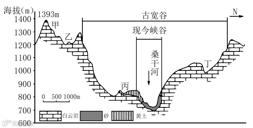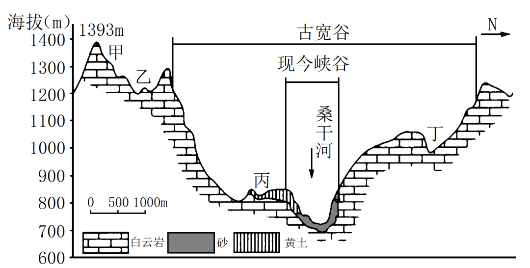 桑干河为永定河上游,是海河重要支流,流经土家湾峡谷段时河道蜿蜒曲折,河床有大量沉积物。两岸是“V”形狭谷上叠置“U”形宽谷的“谷中谷”地貌。下图为“谷中谷”地貌剖面图。据此完成下面小题。