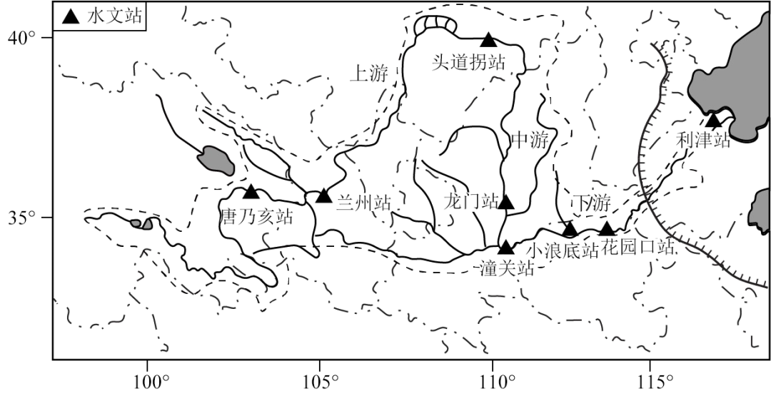 含沙量大是黄河最突出的水文特征,其挟带泥沙数量居世界大河首位。我国通过实施水土保持工程,兴建水利工程,对黄河各段的输沙量影响较大。左图示意黄河干流主要水文站分布,右图示意部分水文站的不同阶段实测年均输沙量。据此完成下面小题。