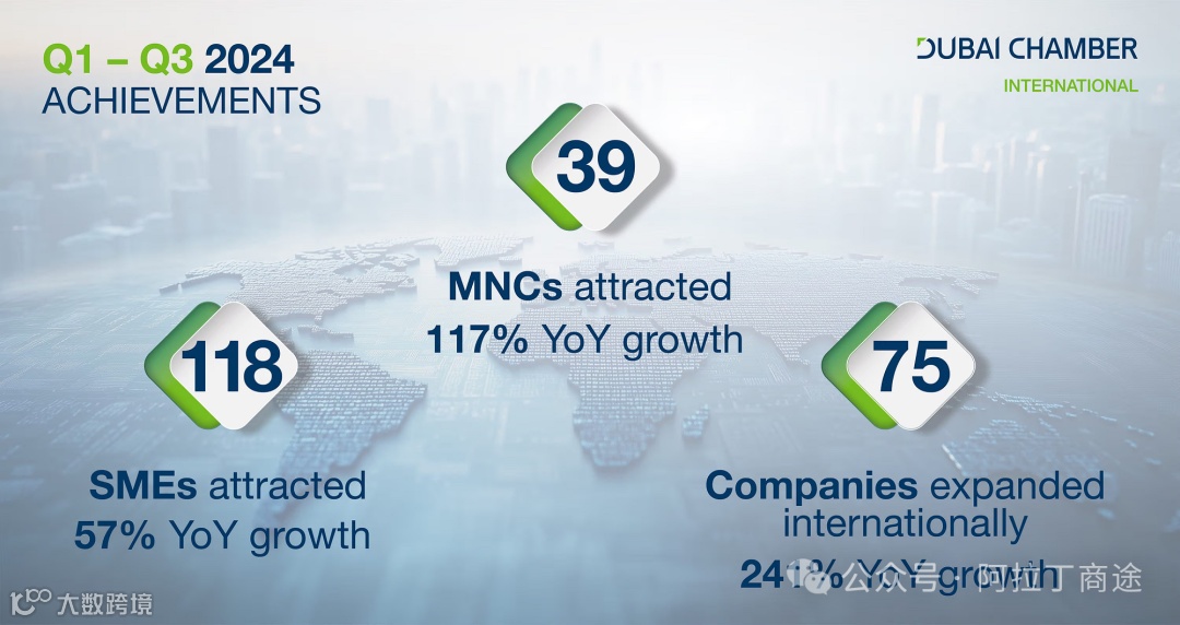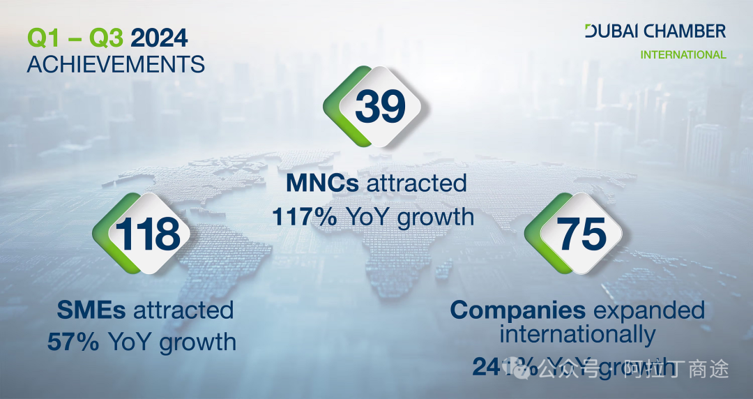 细究之下,跨国公司的入驻情况尤为亮眼。2024 年前三季度共吸引 39 家跨国公司扎根迪拜,较 2023 年同期的 18 家实现了 117% 的飞跃式增长;中小企业同样不甘示弱,118 家中小企业纷至沓来,相较 2023 年前 9 个月的 75 家,增幅达 57%。这一组组数据,恰似节节攀升的经济曲线,生动勾勒出迪拜国际商会在招商引资领域的强劲 “磁力”,吸引着全球各类企业奔赴这片充满机遇的土地。