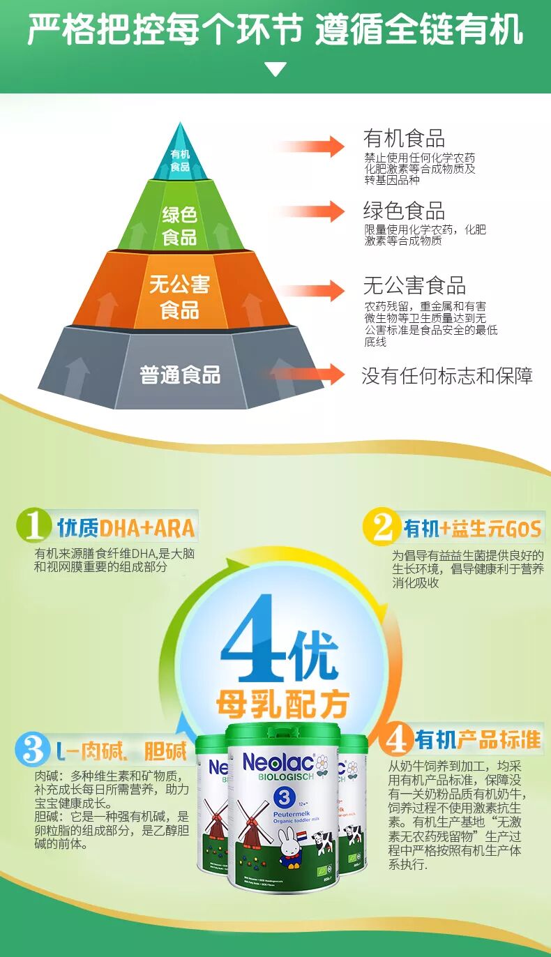 Neolac悠蓝是来自荷兰20多年的高端婴幼儿有机奶粉品牌,臻选荷兰2万多个天然牧场中2%的有机牧场,所有奶牛不使用促进生长的抗生素和激素,不使用奶牛胚胎基因繁殖技术,从饲养到加工保障全线有机品质,通过欧盟和荷兰双重有机认证。