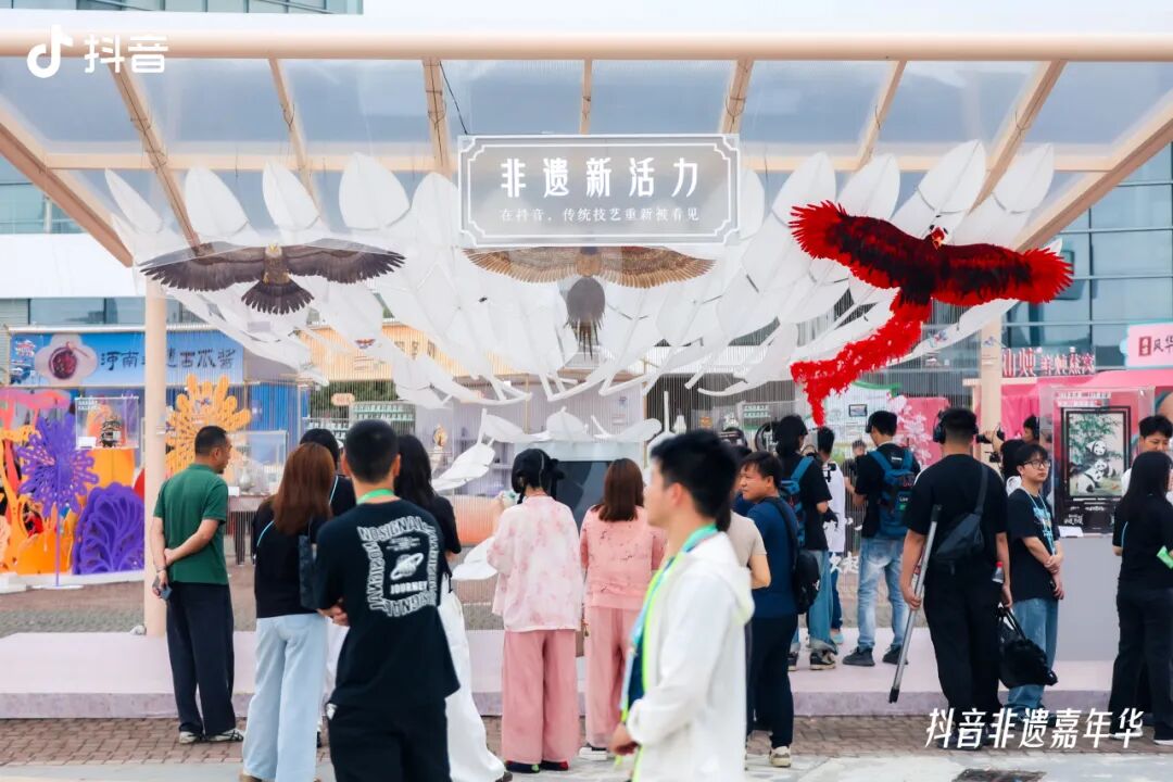 非遗节现场设有五大抖音非遗展区,展示抖音通过科技创新带动非遗传播传承、助力非遗“见人,见物,见生活”的生态图景,引来游览观众驻足观看。