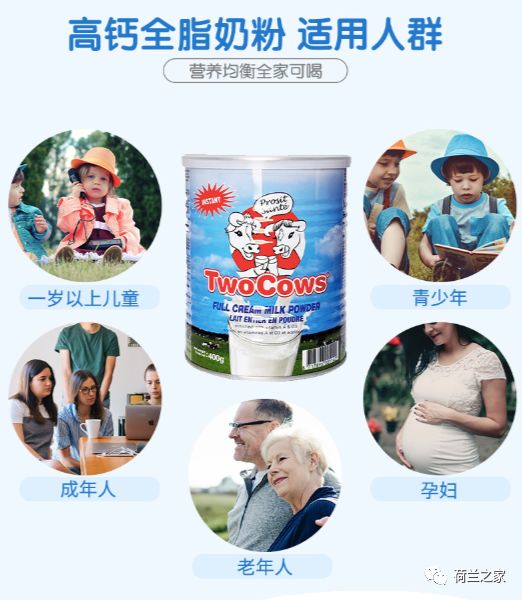 Two Cows奶粉由鲜牛奶制成。并加添多种营养成分,提供人体健康所需,含丰富钙质,蛋白质,碳水化合物,维他命及多种矿物质。整个生产过程在荷兰的奶牛基地,由鲜奶采购到最后完成,全程掌控,以确保品质,是符合欧盟奶粉检验标准的高质量奶粉,孕妈妈也可以放心喝哦~