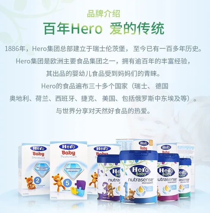 Hero baby是荷兰皇家乳业旗下百年奶粉品牌。美素的奶源和一般的乳业集团不同,荷兰皇家乳业是合作型乳企,由欧洲超过20,000名左右会员农场主联合经营,共同管理,完全从源头来把控。