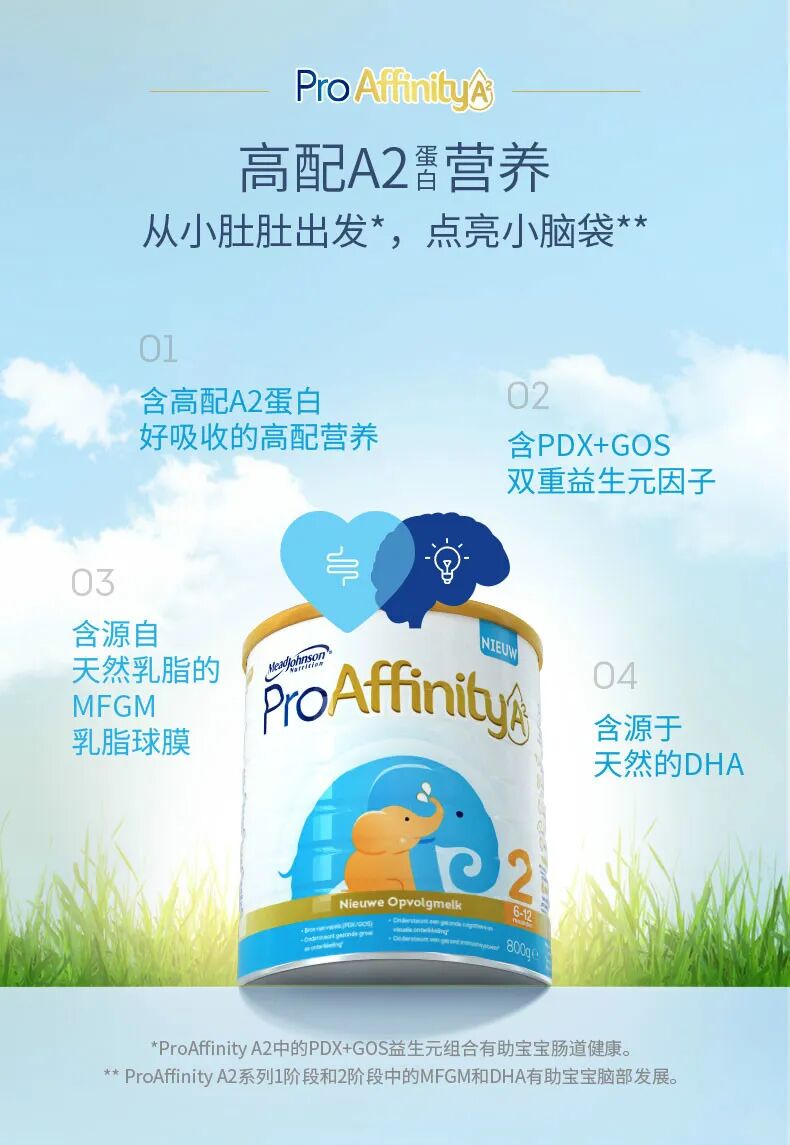 美赞臣ProAffinity A2婴幼儿配方奶粉除了含有纯正高配的A2蛋白、维生素C和D,还特别添加MFGM乳脂球膜、专利PDX+GOS双益生元组合。既可以支持脑部发育,提升宝宝认知能力;又可以提高宝宝免疫力;同时对肠道菌群有改善作用。