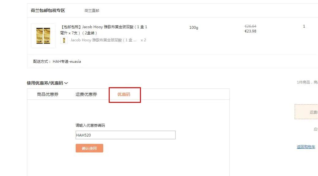 在购物车结算处,填入【HAH520】
