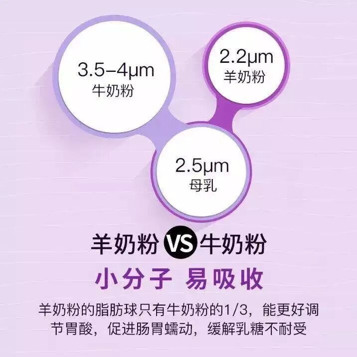 羊奶在国际营养学界被称为“奶中之王”,脂肪颗粒体积为牛奶的1/3,所以即使不是过敏体质的宝宝,喝羊奶粉也更利于宝宝吸收,并且营养更丰富,更利于养成健康聪明宝宝哦~