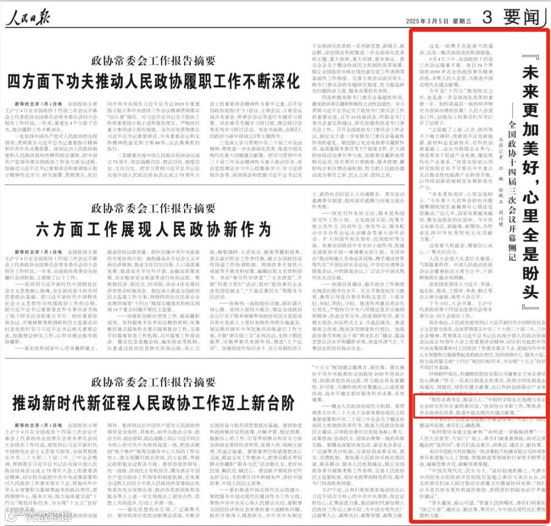 人民日报刊发《“未来更加美好,心里全是盼头”——全国政协十四届三次会议开幕侧记》,其中报道中科院东北地理与农业生态研究所所长姜明委员表示,“报告求真务实、振奋人心。我将结合本职工作,聚焦进一步全面深化改革、推进中国式现代化建言献策”。