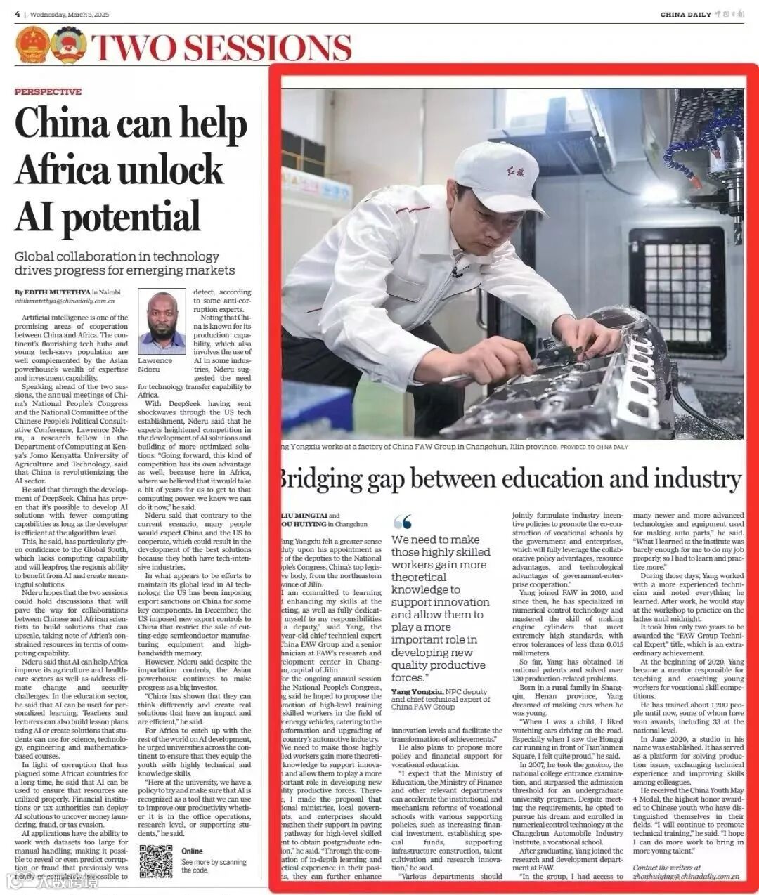中国日报刊发《搭建教育与制造业之间的桥梁(Bridging gap between education and industry)》,报道全国人大代表,中国一汽首席技能大师、研发总院试制部高级技师杨永修建议提升许多身处生产一线的高技能人才的学历,为行业技术创新和产业升级提供有效智力支持,进一步提升创新水平,促进创新成果加速转化。