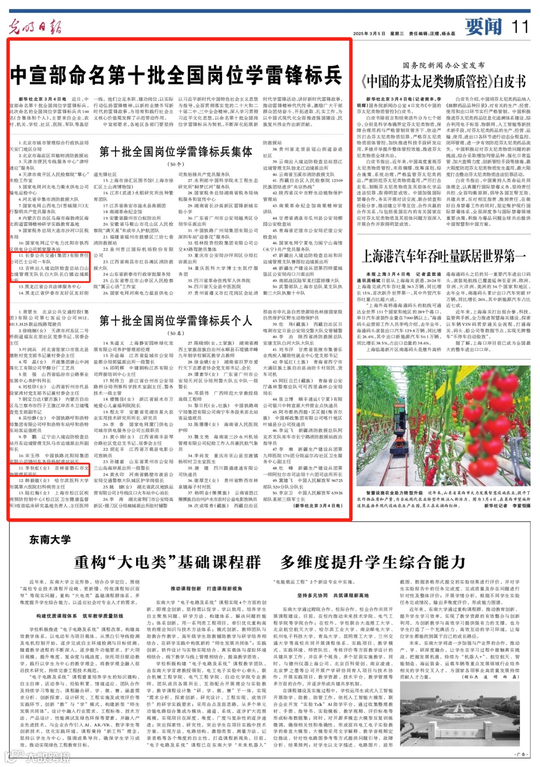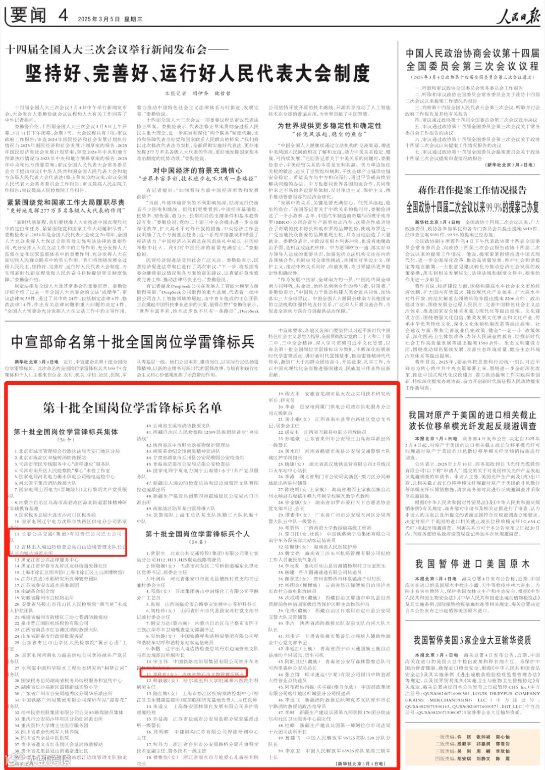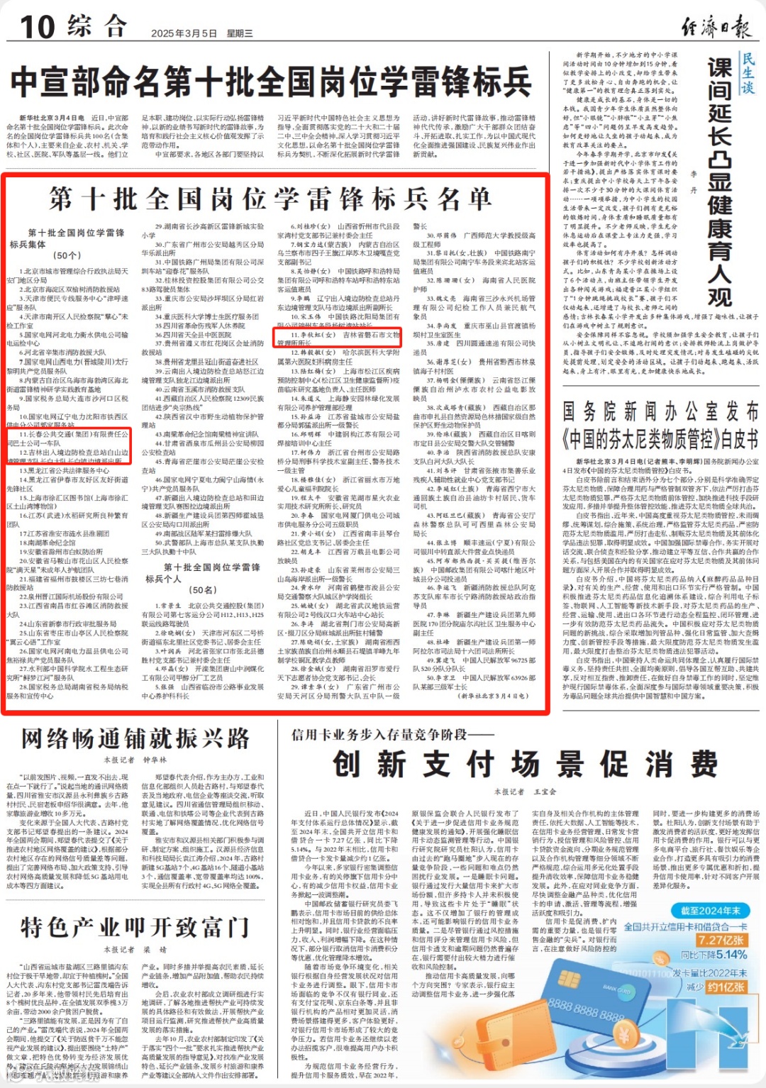 人民日报、光明日报、经济日报刊发《第十批全国岗位学雷锋标兵名单》,其中报道长春公共交通(集团)有限责任公司巴士公司一车队、吉林出入境边防检查总站白山边境管理支队长白大队长白镇边境派出所荣获第十批全国岗位学雷锋标兵集体;吉林省磐石市文物管理所所长李秋虹(女)荣获第十批全国岗位学雷锋标兵个人。