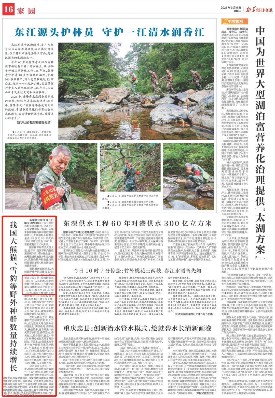 新华每日电讯刊发《我国大熊猫、雪豹等野外种群数量持续增长》,其中报道东北虎、东北豹数量分别由2017年建立国家公园体制试点之初的27只、42只增长至70只、80只左右。