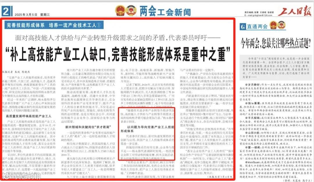 工人日报刊发《面对高技能人才供给与产业转型升级需求之间的矛盾,代表委员呼吁——“补上高技能产业工人缺口,完善技能形成体系是重中之重”》,其中报道全国人大代表,中国一汽首席技能大师、研发总院试制部高级技师杨永修围绕推动解决高技能人才短缺问题建言献策,建议完善产业工人技能形成体系,培养更多高技能人才,造就一流产业技术工人队伍。