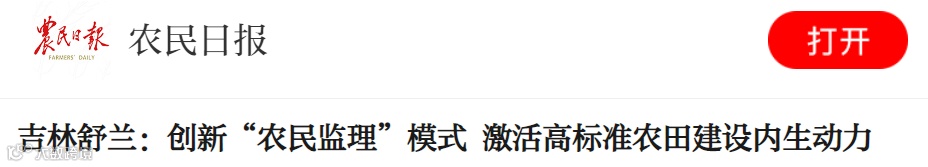 农民日报客户端刊发《吉林舒兰:创新“农民监理”模式 激活高标准农田建设内生动力》,报道舒兰市平安镇创立的“政府监督+村干部代表监理+农民参与”的高标准农田建设质量监管体系,正在全市产生示范效应,今年将新建13万亩高标准农田,到2028年把185.66万亩永久基本农田全部建成“田稳产、水畅流、路成网”的高标准农田体系。