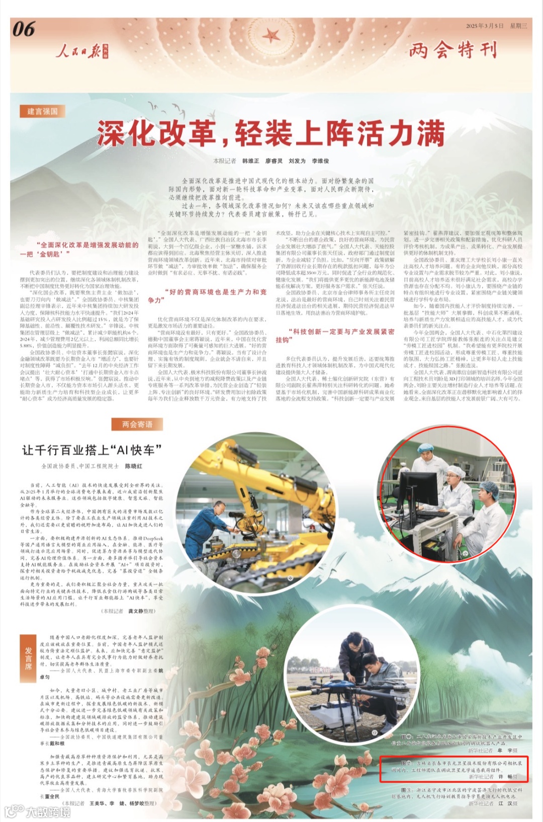 中国日报网刊发《韩凤香代表:黑土地上为乡村振兴代言》,报道全国人大代表、吉林省梨树县凤凰山农机农民专业合作社理事长韩凤香,积极推广黑土地保护 “4 + 2 梨树模式” 升级版,以科技赋能现代化农业,并提出加大农机补贴、强化技术培训等建议,为乡村振兴精准传递农民心声;刊发《李文辉代表:深耕能源领域,担当代表使命》,报道全国人大代表、国家电投吉林能投白山分公司设备部主任李文辉,在今年全国两会提出的建议涵盖能源发展、民生改善及教育提升等多个领域,精准地把握了民生需求和国家高质量发展的关键问题;刊发《白玉晶代表:“管”好排水,“理”好民生》,报道全国人大代表、辽源市水务集团公司排水维护队队长白玉晶,关注民生保障类企业协同服务的问题,建议水务、电网等企业实现信息共享、高效衔接,让 “城市生命线” 更好地协同作战,提升服务效率。