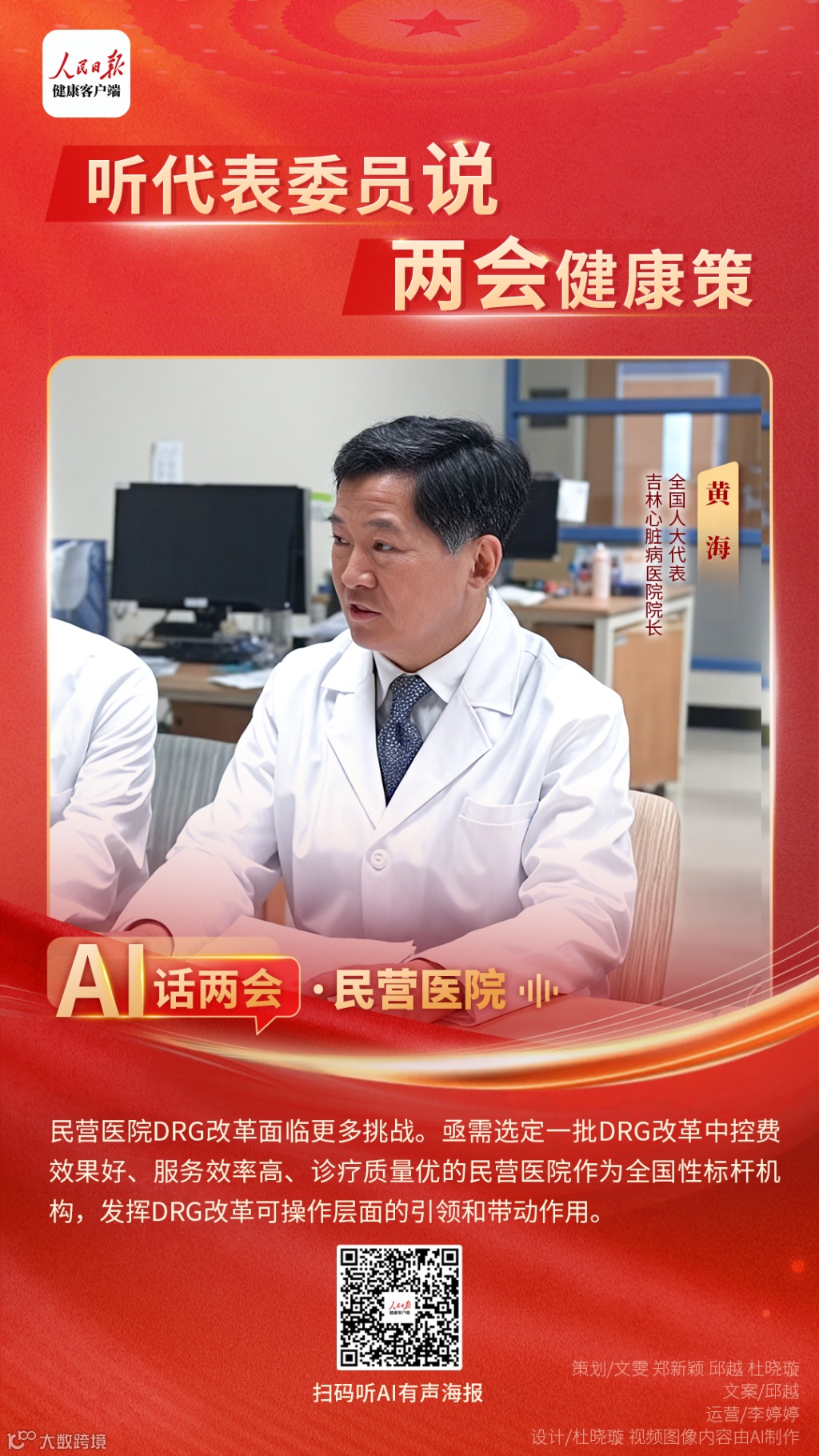 人民日报客户端刊发《AI话两会|听代表委员说两会健康策》,其中报道全国人大代表、吉林心脏病医院院长黄海表示,民营医院等非公医疗机构DRG改革亟需选定一批DRG改革中控费效果好、服务效率高、诊疗质量优的民营医院作为全国性标杆机构,发挥DRG改革可操作层面的引领和带动作用。