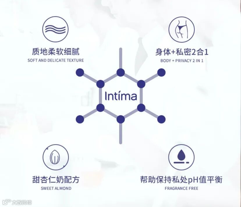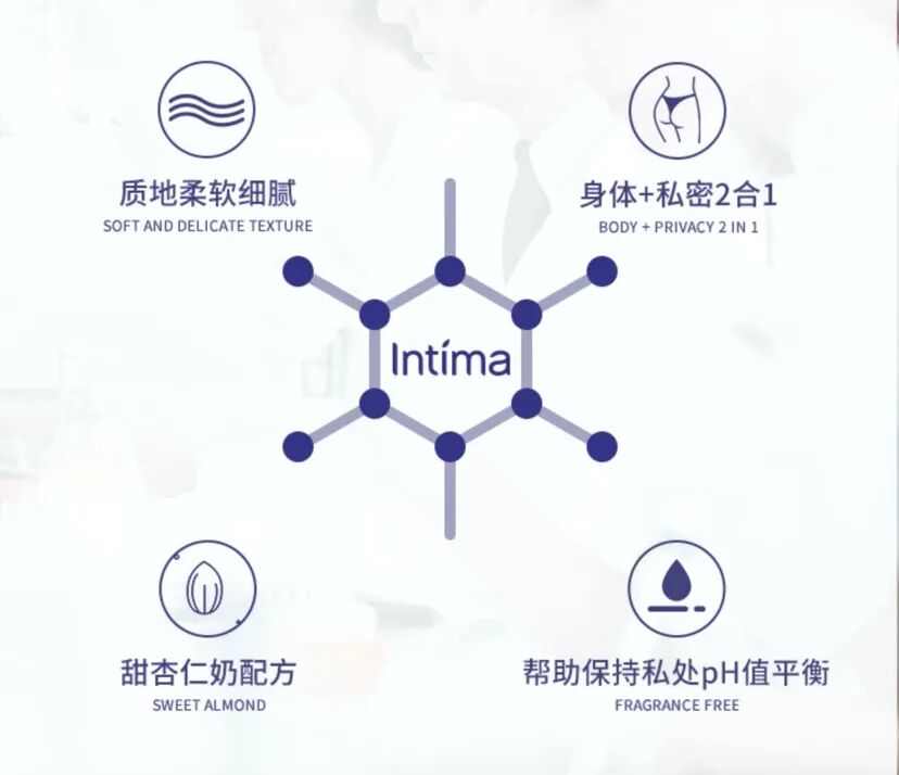 intima来自法国,产品经过皮肤科和妇科测试,品质值得信赖,温和配方,质地柔软细腻,含甜杏仁奶配方,采用身体+私密2合1,更加方便快捷,5.3pH更好有效保持私处pH值平衡。