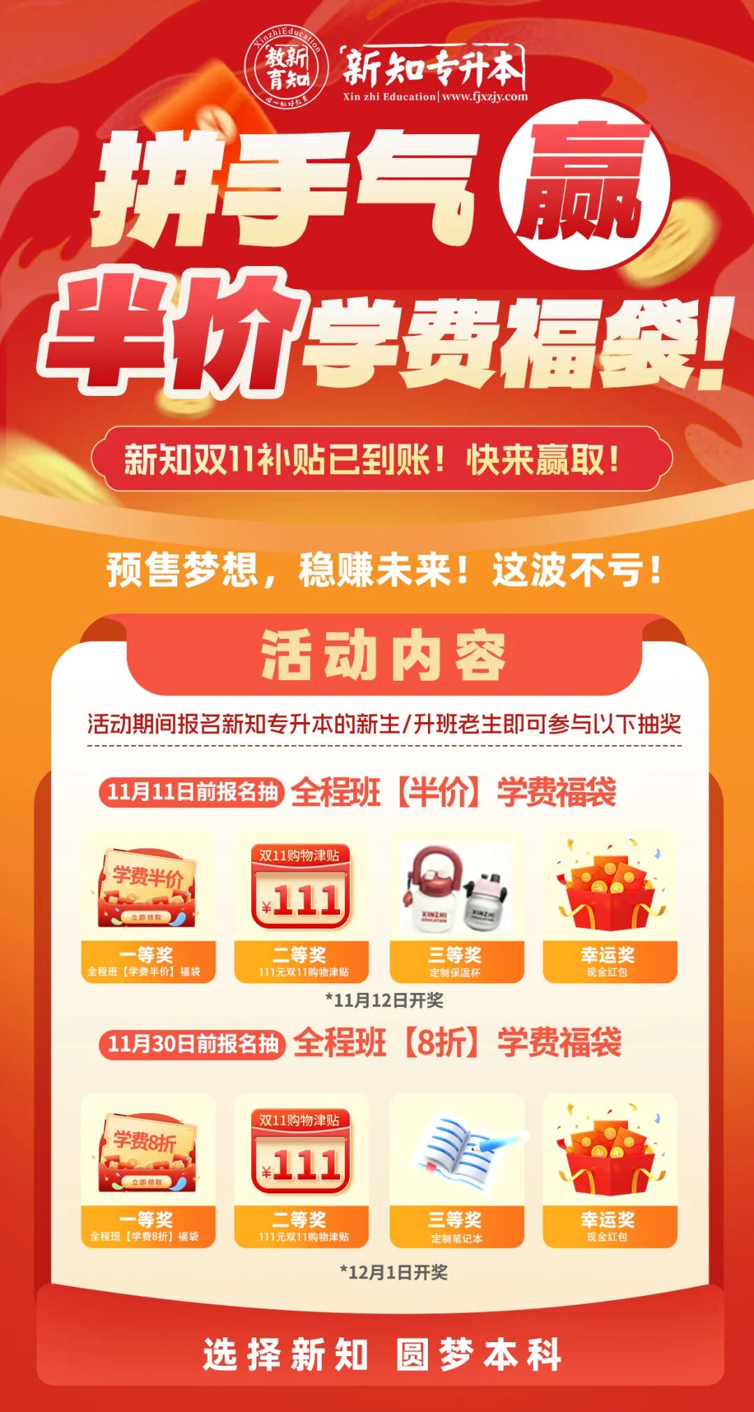抽奖对象:即日起至11月11日,报名专升本的新生/升班老生