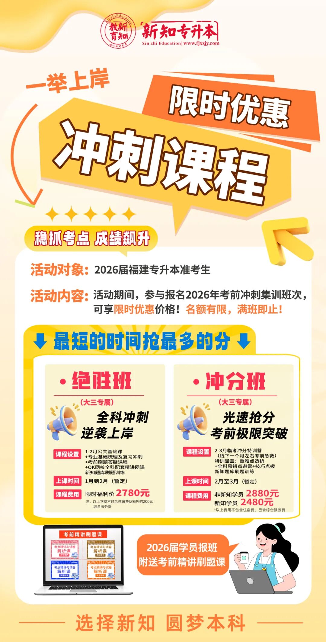 活动内容:即日起,参与报名2026年考前冲刺集训班次,可享限时优惠价格!名额有限,满班即止!