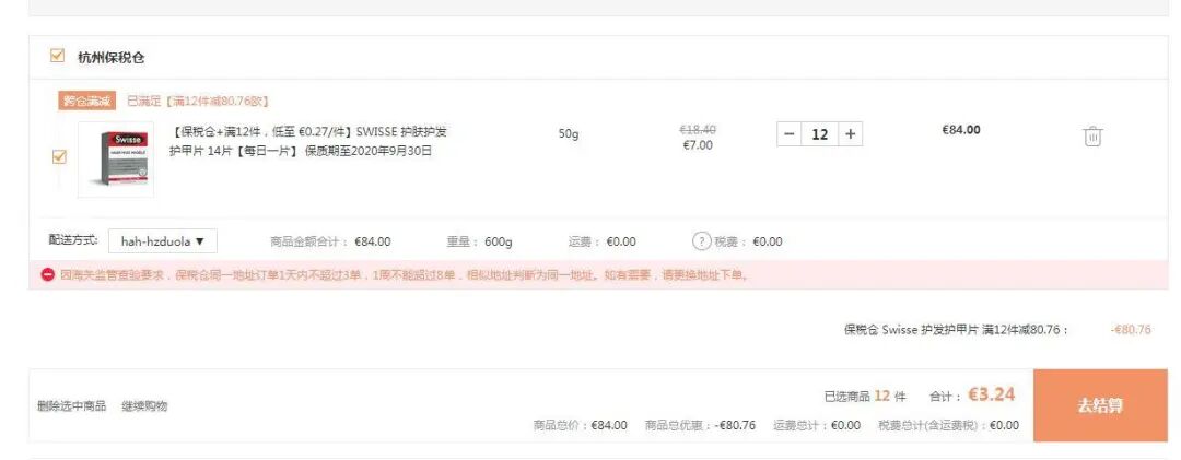 PS:加入购物车数量:3,实付一瓶价到手三瓶,到手仅4.2欧/瓶