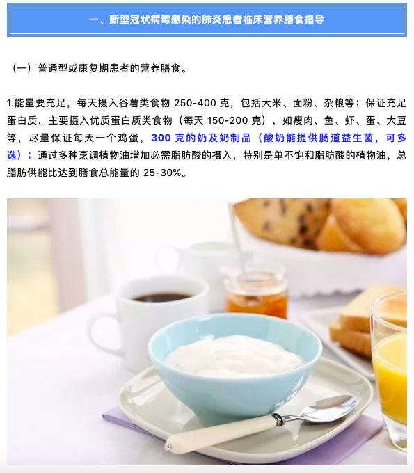 据《新型冠状病毒感染的肺炎防治营养膳食指导》提供的营养支持方案,其中主要提到了常规的蔬果、肉类、水产、大豆等;另外重点提及,有条件尽量保证每天喝300克奶及奶制品(譬如奶粉)。