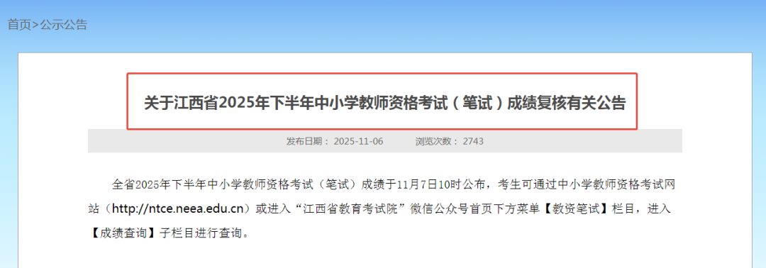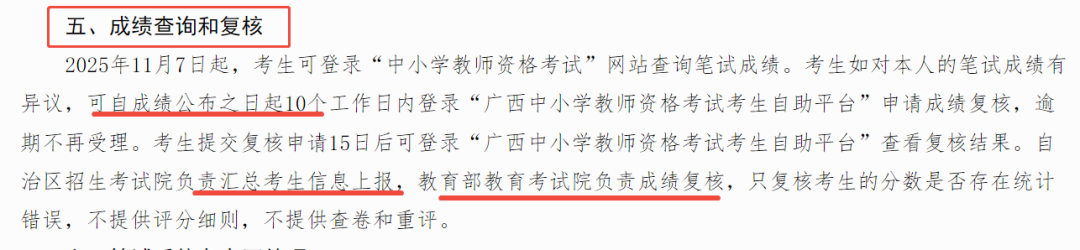 一般,教资笔试报名公告的【成绩查询与复核】部分会提到复核的相关内容,会写明复核时间及方式。例如广西教资笔试公告↓