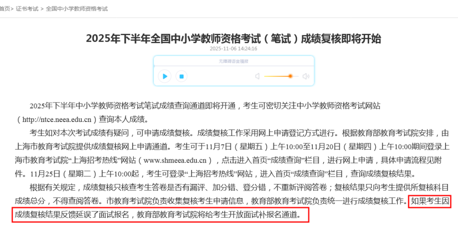 上海公告:如果考生因成绩复核结果反馈延误了面试报名,教育部教育考试院将给考生开放面试补报名通道↓