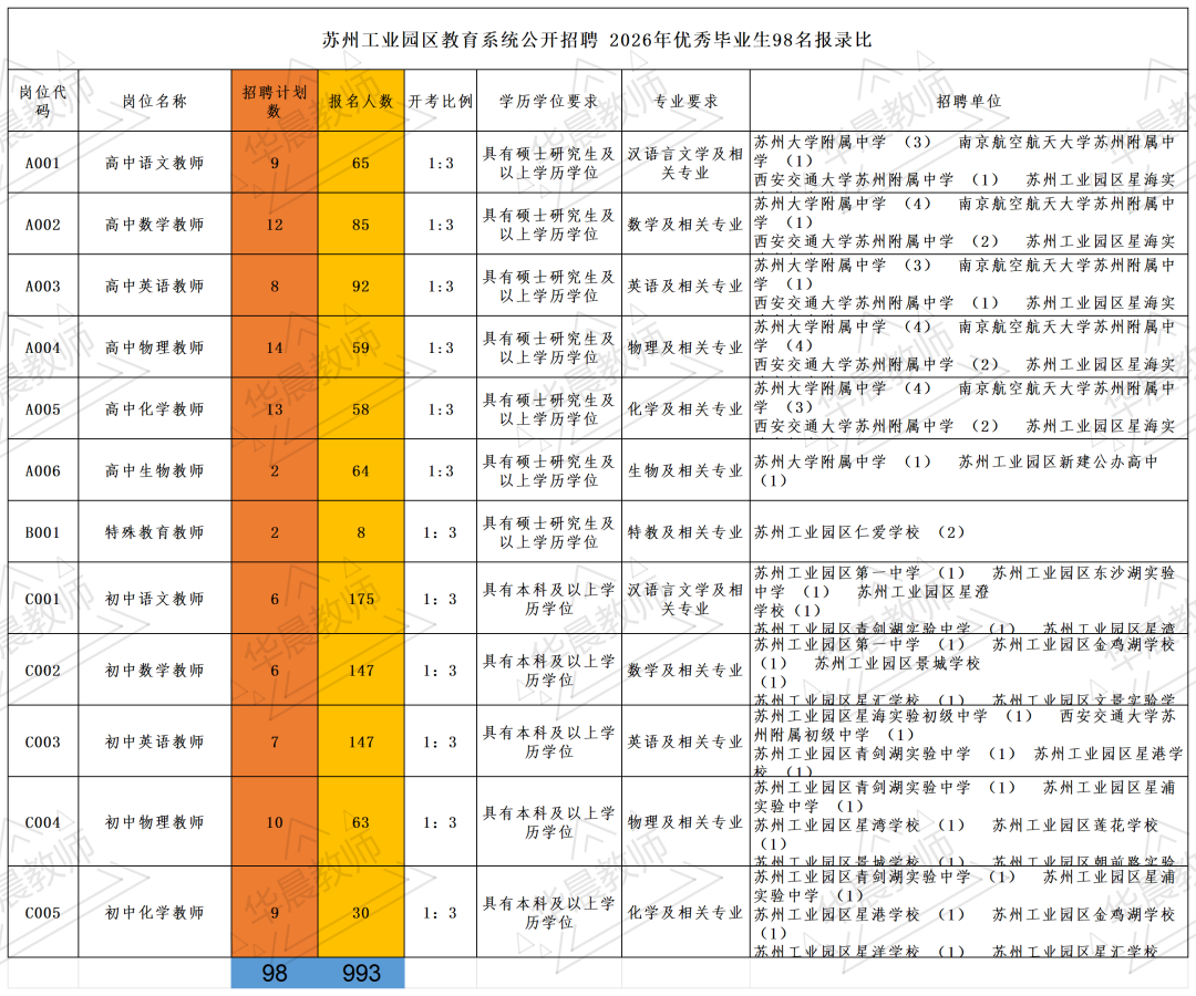 苏州工业园区教育系统公开招聘2026年优秀毕业生98名(事业编制)