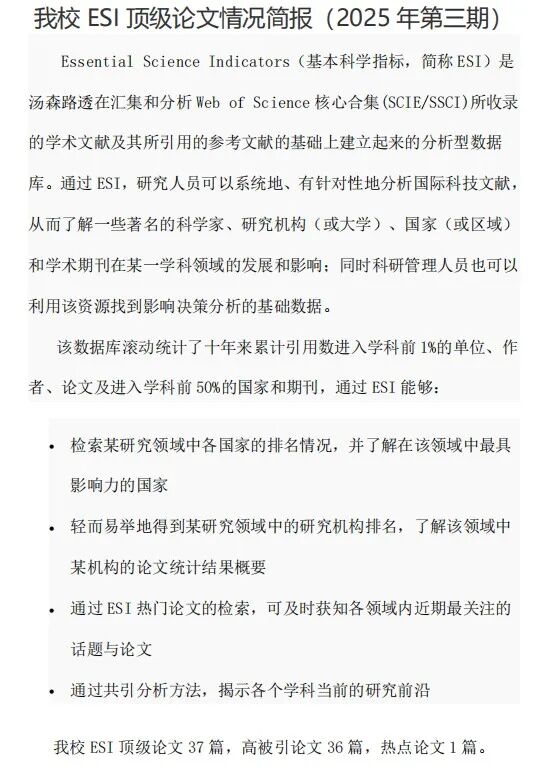 本期(2025年第三期)我校ESI顶级论文共37篇,高被引论文36篇,热点论文1篇。