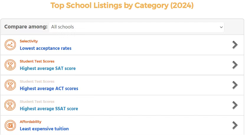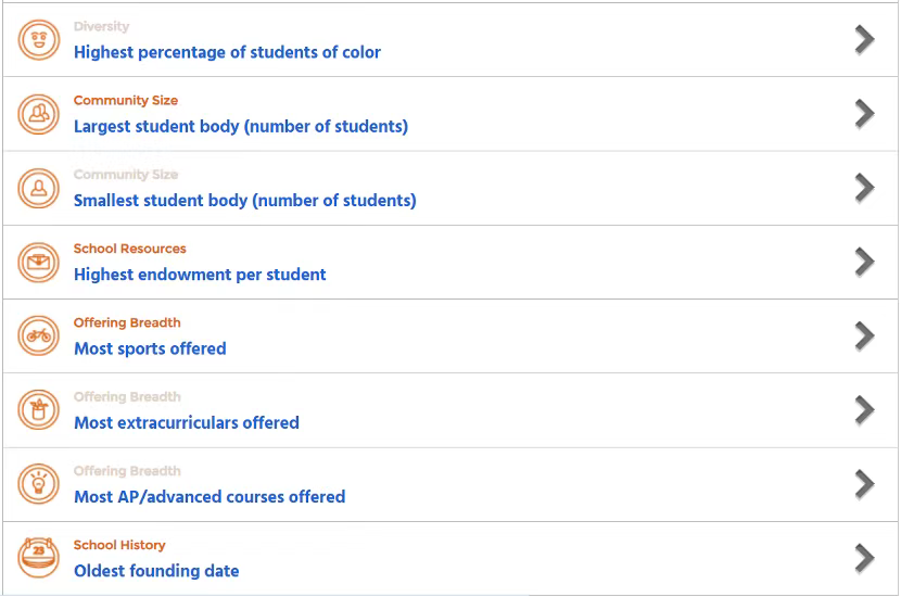 最低录取率、最高平均SAT成绩、最高平均SSAT成绩、最低学费、获得经济援助的学生比例、班级平均人数、师生比例、拥有高级学位的教师比例、寄宿学生比例、国际学生比例、有色人种学生比例、最大学生团体规模、最小学生团体规模、最大捐赠基金规模、学生人均获得捐赠金额、最多的体育运动项目、最多的课外活动、AP/高级课程数量以及学校的历史悠久程度等。